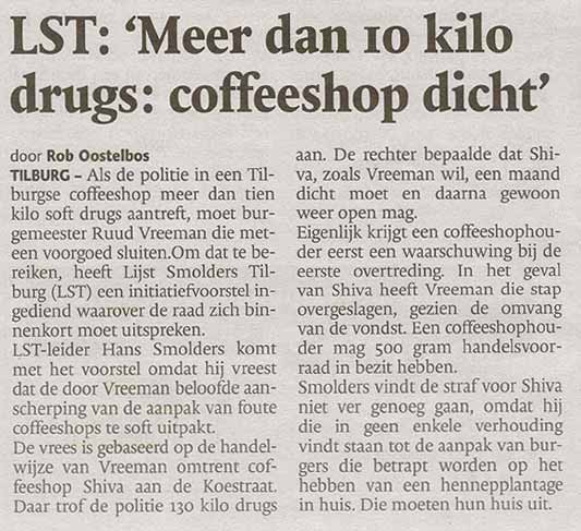 De LST-fractie vindt dat onderdeel van die strenge aanpak moet zijn dat coffeeshops, die meer dan 10 kg drugs in huis hebben, per direct en voorgoed gesloten moeten worden.